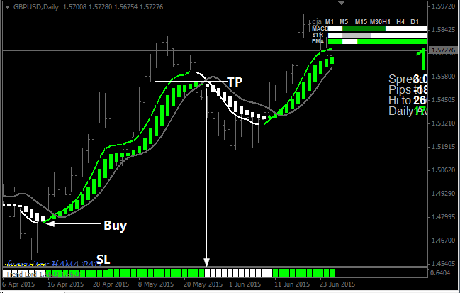 - At least one of the three indicators (MACD, STR and EMA) should be green in color.
